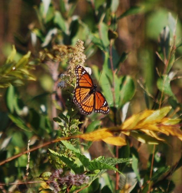 Jerry Sitarski recently took this photo of a Viceroy butterfly feeding on Meadow Sweet. The viceroy is a Mullerian (Tastes bad to birds) mimic of the Monarch butterfly that can be distinguished by the black line that runs across the veins on the hindwing. It's caterpillar feeds on Willow and cottonwood trees versus the Monarch preferring milk weed. I recommend readers compare this photo to the monarch butterfly submitted below.