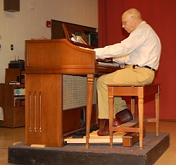 (left) Don Hamman entertained with his organ playing - (right) Martha Mueller and Chris Bihler cut the "anniversary cake"