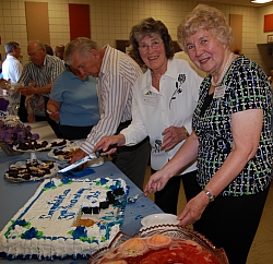 An open house and cake cutting was held Sunday, May 23rd at the Golden Age Center to celebrate its 50th year anniversary. Pictures from past years, shown on a big screen TV, was a special treat especially to those who have been members of the center for many years. A basket raffle was held with donations made by several area merchants. Organ music was provided by Don Hamman.