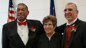 Court Clerk/Marriage officer Maria C. Burns performed the first same-sex marriage at the Town Hall on August 24, 2011. Louis-Victor Jeanty, M.D. and Thomas Gormady exchanged vows on the 23rd anniversary of the day they met. Tom is an honors graduate of Grand Island High School, Class of 1976, and was well known in the area for his love of art and music and for his theatrical performances. He performed onstage at Fantasy Island's Golden Nugget Review from 1978-1981. He holds a B.A. degree in Design from Buffalo State College. Louis-Victor graduated from New York Medical College, worked locally as a psychiatrist at the Buffalo Psychiatric Center and originates from Gonaives, Haiti. They currently reside in Fort Lauderdale, Florida.