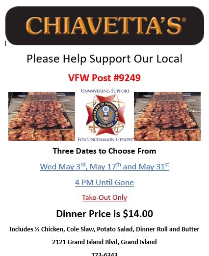 The VFW 9249 & Auxiliary, Grand Island, NY will be the location of a Chiavetta's pop-up event Saturday, March 11, serving 12:00-6:00. $14 chicken dinner, $18 1/2 rack rib dinner. Cash & Card will be accepted.