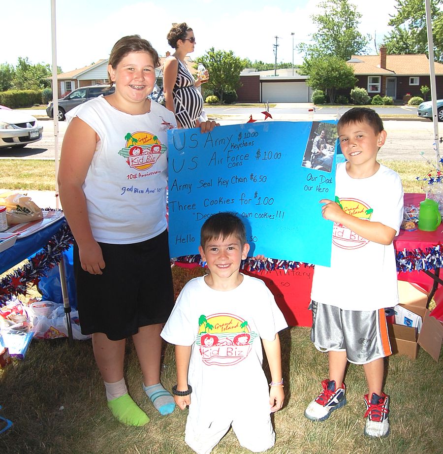 The children of 1st Sargent Timothy Hanlon, U. S. Army, used the June 23rd Kids Biz event to honor their dad who is on his third tour of duty. He is presently in Afganistan and is expected to be home in September. Along with other items Timothy's children had for sale were U. S. Army key chains, U. S. Air Force coins and Arm Seal key chains. Pictured are Allie, William and Matthew Hanlon.Kid Biz Huge Success
