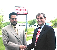 Chamber President James Sharpe (right) welcomes Chateau Motor Lodge owner Parmpreet S. Chhokar, 1810 Grand Island Blvd. (773-2868).