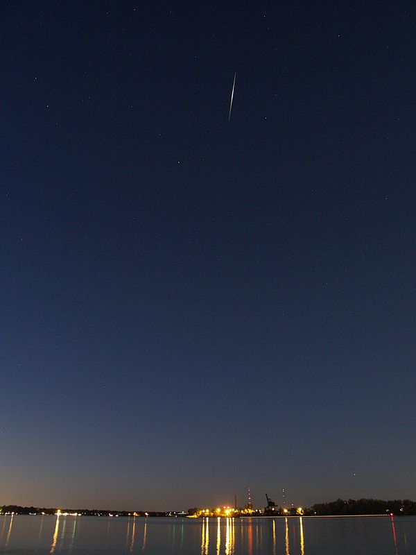 Craig Kopra captured this scene on Saturday night, October 9, 2010 at the kayak launch area near Beaver Island. Craig explained that the streak is the satellite, Iridium 10, and light reflecting off the left antenna for a 15 second exposure. It was an impressive -3 magnitude. The north star, Polaris, is not far away to the satellite's lower left. "I was hoping to capture more of the river, but was unsure how much higher in the sky the flare would be," Craig wrote.