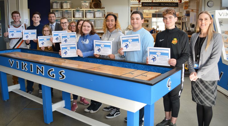 Pictured from left to right: Sitting - Bethany Kulikowski, Adison Fike; standing - Samuel May, Abigail Jackson, Assistant Principal Karen Surdyke, Assistant Principal Hillary Kretz-Harvey, High School Principal Michael V. Lauria, Brooke Conway, Eleah Leng, Zachary Leng, Ivan Lalata and Connor Raine.