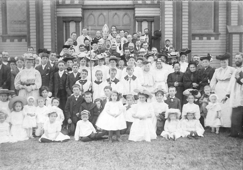 This old photo could be a confirmation at St. Stephen's Church before it was remodeled. The Bishop is shown in the back and three boys are wearing boutonnières and two girls are wearing veils.
