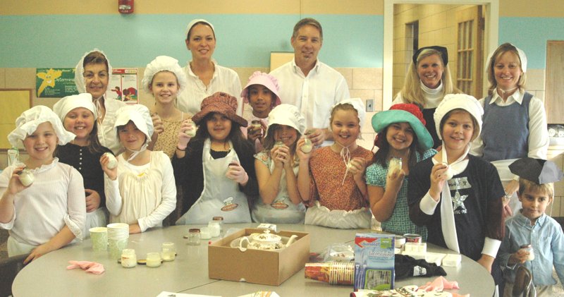 Mrs. Kathy Chadwick’s 4th grade students at Kaegebein Elementary celebrated “Colonial Day” on Tuesday, November 22nd. This day is based on a class novel the students read called "Felicity Learns a Lesson". The girls prepare the dinner meal. They make applesauce, butter, peel and mash potatoes, and prepare the stuffing. The boys learn lessons from hornbooks. The girls learn how to cross stitch and have a tea party. The boys learn about Colonial occupations and construct a sign to go with an occupation they are interested in. Both the boys and girls make soap, carve soap, write with a quill feather and ink, and stencil. This year Mr. Rizzuto, an Old Fort Niagara re-enactor, taught the students Colonial games. All the boys and the girls enjoyed this authentic experience of Colonial times.