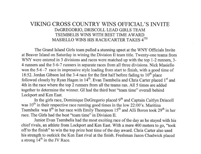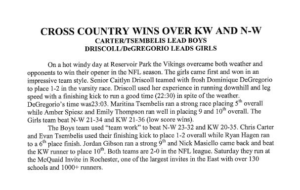 Sept. 27 2007 . . . Boys and Girls Cross Country Meets for this week of Sept. 27, submitted by Coach Don Sauer.