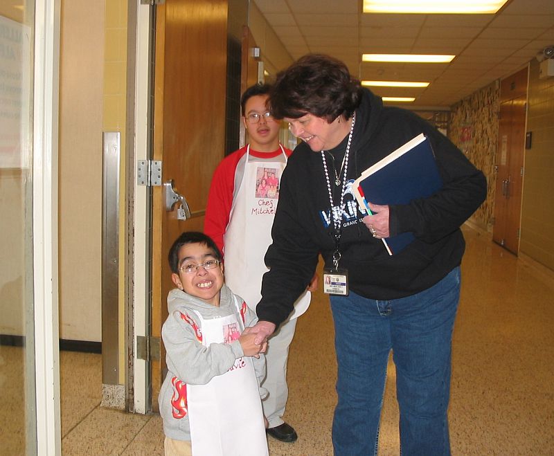 ![]() Click photos for larger view. Students of Veronica E. Connor’s Life Skills Program prepared a Charity Breakfast for parents, faculty and staff on Friday, January 23, 2009. Javier Solis, Samantha Bartolotta, Mitchell Weis, and Tamara Khairallah worked diligently with FACS teacher, Mrs. Mary Jane Fonte and Life Skills teacher, Ms. Tracy Shores to prepare a hot breakfast on a very frigid morning to over 50 people. The students prepared the meal, sold tickets, made centerpieces, and set up and cleaned up. The whole mood was complete with Chef Aprons that the students made in FACS class. Faculty and staff were greeted at the door with a handshake and a picture taken with the Life Skills students. The money that was earned will be given to National Down Syndrome Society (NDSS), Little People of America (LPA), and Veronica E. Connor’s Life Skills Program. Altogether the students raised $275!!! It was a wonderful experience and something we all will look forward to again next year. Connor’s Monthly Master - Cassie Oursler - Jan. 2009