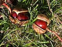 Closeup of a horse chestnut/buckeye: October, 2004 Though the rich brown nuts are fun to pick up and have a pleasant texture, they are not edible. The meats are full of tannins like acorns, rendering them terribly bitter and moderately poisonous. There were plenty of these nuts under the tree and no signs of squirrels gathering them for a winter nut larder.