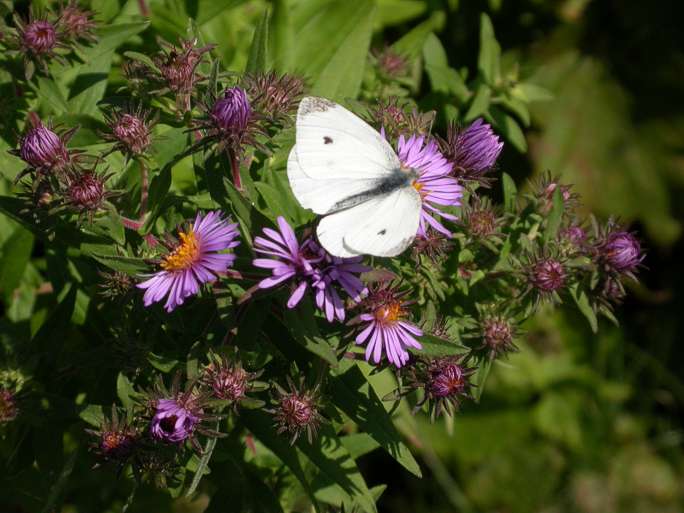 Cabbage Butterfly: September, 2003 This variety of butterfly is most often encountered as a garden pest. They lay their eggs on any crucifers available; cabbage, broccoli, cauliflower etc. Their green caterpillars blend in well with the foliage and are very destructive. This one was photographed visiting a stand of New England Asters.