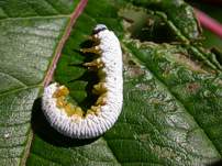 Sawfly larvae under attack: September, 2004 The chalky appearance was first misinterpreted by the photographer as a fungal attack, but apparently this appearance is normal though for a developing sawfly. However, the eggs that are visible around it's legs and prolegs are not. These have been deposited by another insect with plans to use the living larvae as fodder for its own young. Very little goes to waste in nature.