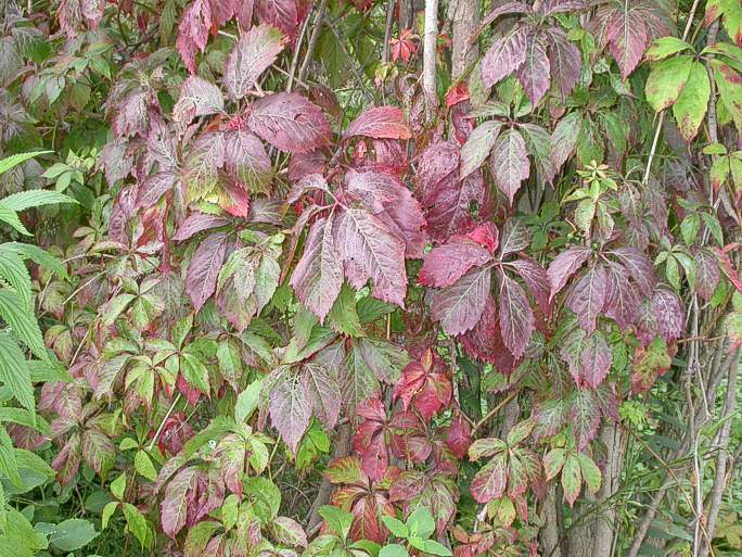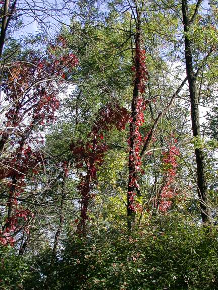 Crimson vines: Early October, 2004 The Virginia creeper vines are now turning fall colors in earnest. These large specimens are going up the trunks of trees in Buckhorn. The tree is merely a form of support to gain access to light; not a host for parasitic activity.