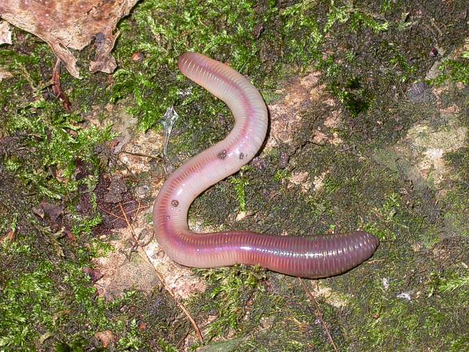 Earthworm on bed of moss: Early August, 2004 We encounter earthworms frequently and likely do not pay much attention to them - unless of course we collect them for bait. This robust specimen was moving across a patch of moss in the woods after one of the numerous rains this summer.