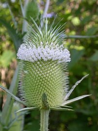 Giant White Teasel: Early August, 2004 In an earlier posting a common purple teasle bloom head was pictured. This variety is very different in overall appearance from the more common purple blooming variety. These plants grow to 10 foot in height or more and have lower leaves that encircle the thorny stalk. Rain collecting in these "leaf basins" and mosquito larvae may be found in the stagnant pools.