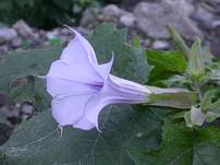 Jimpsonweed flower: Early August, 2004 The flower is large and attractive. The color ranges from pure white to lavender. In the past 100 years it has become a popular flower garden plant under the name of Datura or Angels Trumpet. Trimming or removing the plants sends up an unpleasant odor (hence stinkweed) that tends to stick to the hands. The plant also may stain the skin and clothing a putrid green.