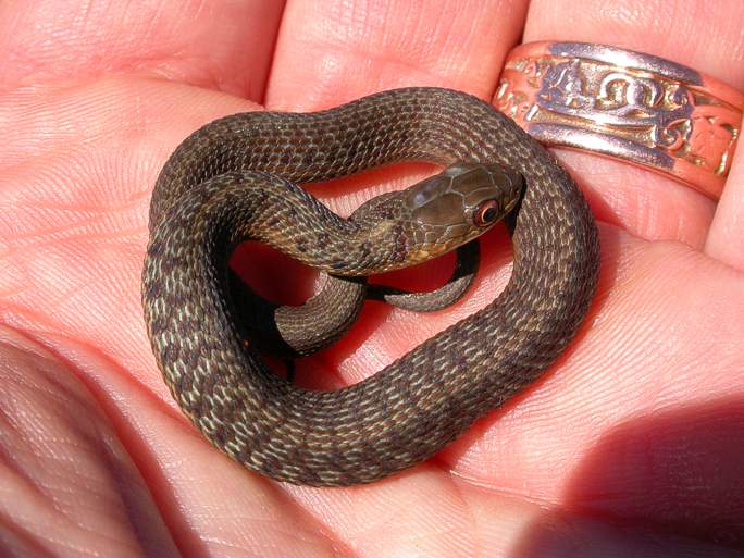 Juvenile garter snake: September, 2004 This young garter snake was found on the edge of the lake between GI and Beaver Island. It was probably less than 8 inches long and very alert.