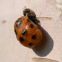 Ladybeetle pupae: September, 2004 The hatched ladybeetle larva feed on small soft-bodied insects until they reach full growth. At that point they pupate; attaching to a sturdy surface, shedding their larval skin and completing development into an adult - much like the caterpillar to butterfly cycle.