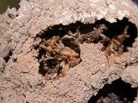 Opportunistic weevil species: September, 2004 The overview above makes their life cycle seem simple and without hazard but they too have predators and freeloaders. Pictured here is a weevil that will co-develop in the larder chambers; feeding off the spiders and perhaps the young wasps as well. In a series of opened nest, large numbers of these were found an a fair number of dried up larval and pupal wasp bodies.