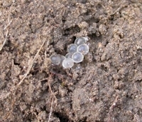 Snail or slug egg cluster: 4-29-04 It is difficult to determine whether it was a snail or a slug that buried this egg cluster. Snails and slugs can over-winter as eggs or adults. This clutch was found under some abandoned building debris dumped in Buckhorn.