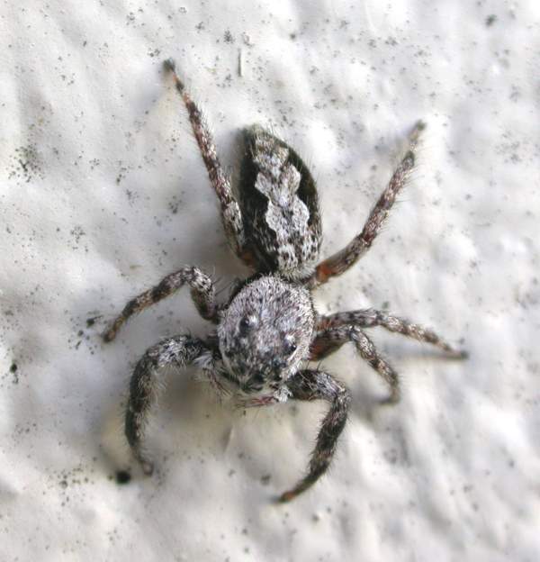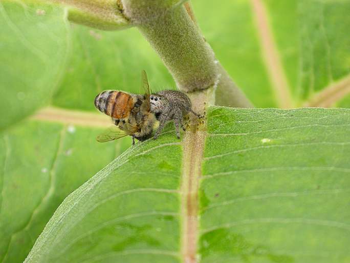 Jumping Spider 1; Honeybee 0: Early July, 2004 As jumping spiders go, this was a large specimen. It had managed to capture a honeybee visiting a milkweed flower. After killing it, the bee was dragged down the stalk to a quiet leaf.