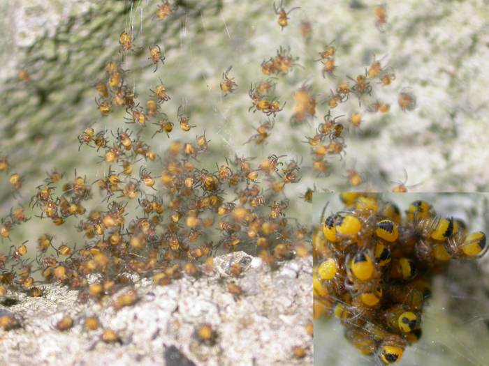 Spiderling wad: Late May, 2004 This is a marble sized wad of newly hatched spiders found on some cinderblock. For up to a week after hatching they stayed close together finally taking to the air on a wisp of silk.