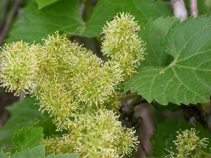 Wild grapes in bloom: June, 2004 Wild grapes are fast growing, high climbing, woody vines, growing well over 100 foot in length. Though their blooms are not striking, they emit a sweet perfume that wafts over the woodlands this time of year. Their tart, purple fruit ripens in mid to late fall.