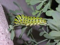 Anise Swallowtail Caterpillar: Early July, 2004 This brightly clolored, yet camouflaged, caterpillar should become a very attractive yellow and black swallowtail. In order to do so though, it must escape parasitic wasps, birds, insecticides and small children.