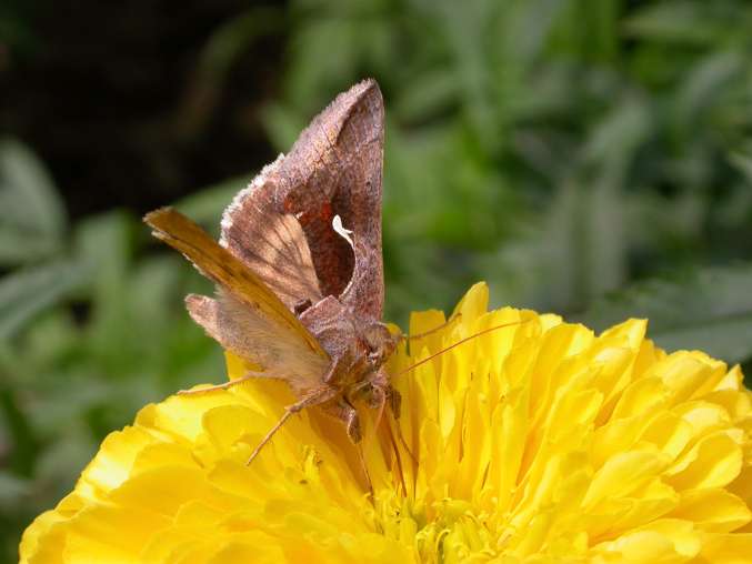 Feeding Moth: July, 2004 This very active moth was found feeding on marigold nectar. Many moths keep to the evening hours for their feedings but this one was out at mid-day just like most butterflies.